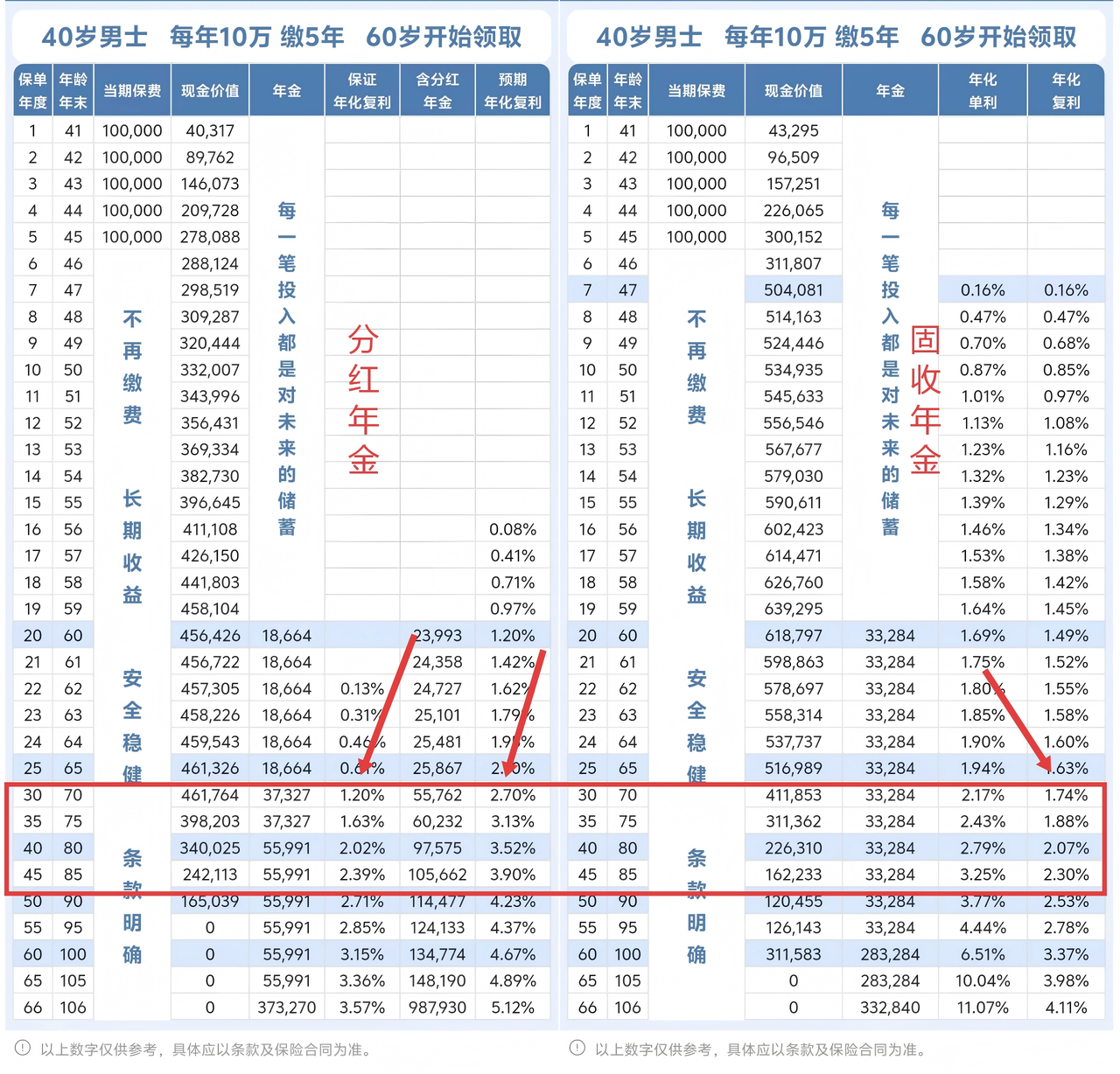 80岁时,分红年金保底复利为2.02%,叠加分红后,预期可达3.52%;固收年金确定复利为2.07%,无分红;