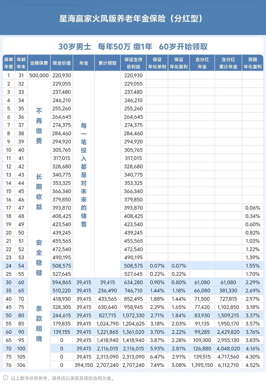 给大家实测,30岁女性,交1年,总计50万保费,60岁开始领取: