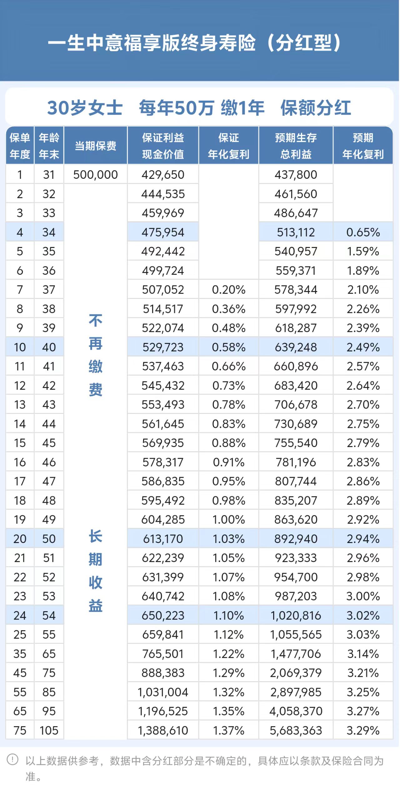 如果中意人寿的投资表现正常(其近 5 年分红产品平均实现率在 83% 左右,多款达 100%),30 年预期复利逼近 3%。