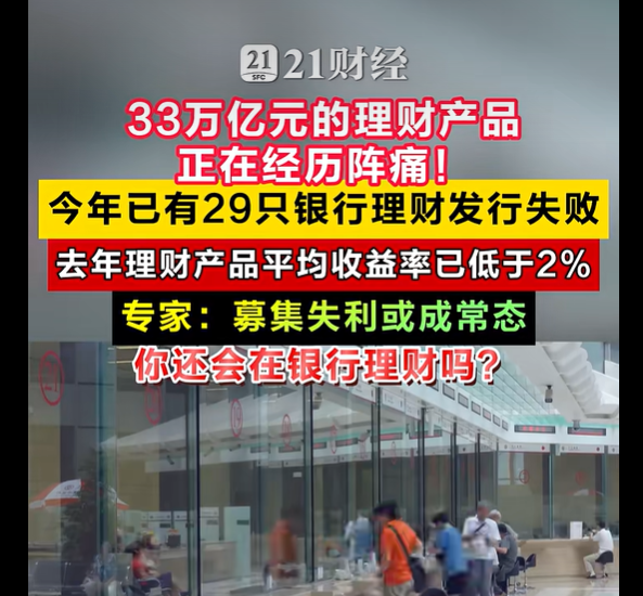 最近去银行办业务,发现一个特别扎心的变化: 33万亿规模的银行理财市场,正在经历一场前所未有的阵痛。 今年开年没多久,已经有 29只银行理财产品发行失败 ; 去年一整年,银行理财平均收益率直接跌破2%,只剩1.98%; 更有2023只产品悄悄下调了业绩基准,连画出来的预期收益饼都越画越小。 专家说得更直白: 理财募集失利,未来可能会成为常态 。 评论区里全是大家的吐