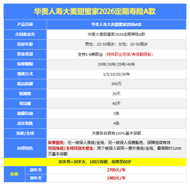 2、华贵大麦甜蜜家2026A款定期寿险