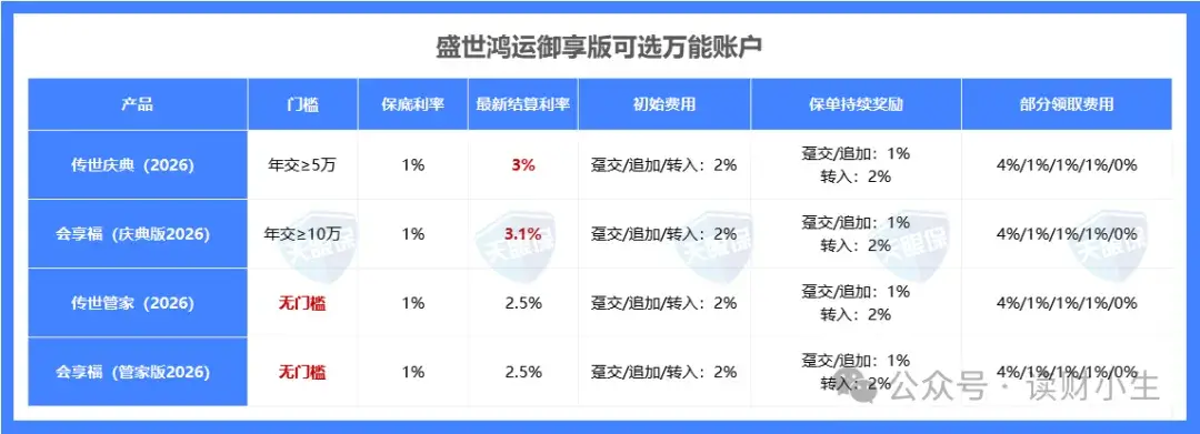 四款万能账户中,保底利率均是1%,在最新结算利率方面最高的是会享福(庆典版2026)为3.1%,相对应的门槛也是最高的,需要年交10万起;其次,最新结算利率高且门槛较低的,是传世庆典(2026),需要年交5万起,这两款万能账户是不支持主险趸交附加的。