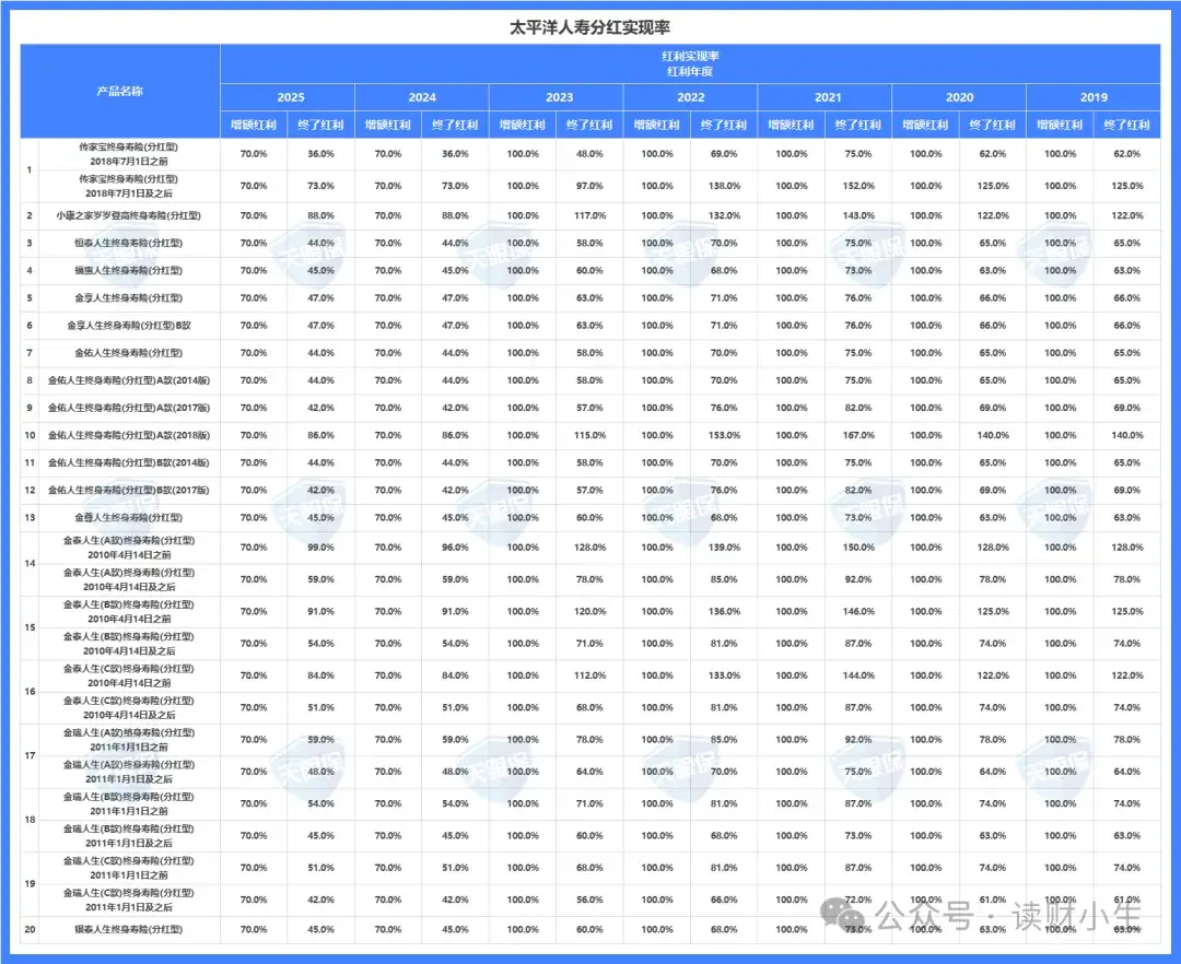 如上图是太平洋保额分红产品的分红实现率汇总,共累计20款;